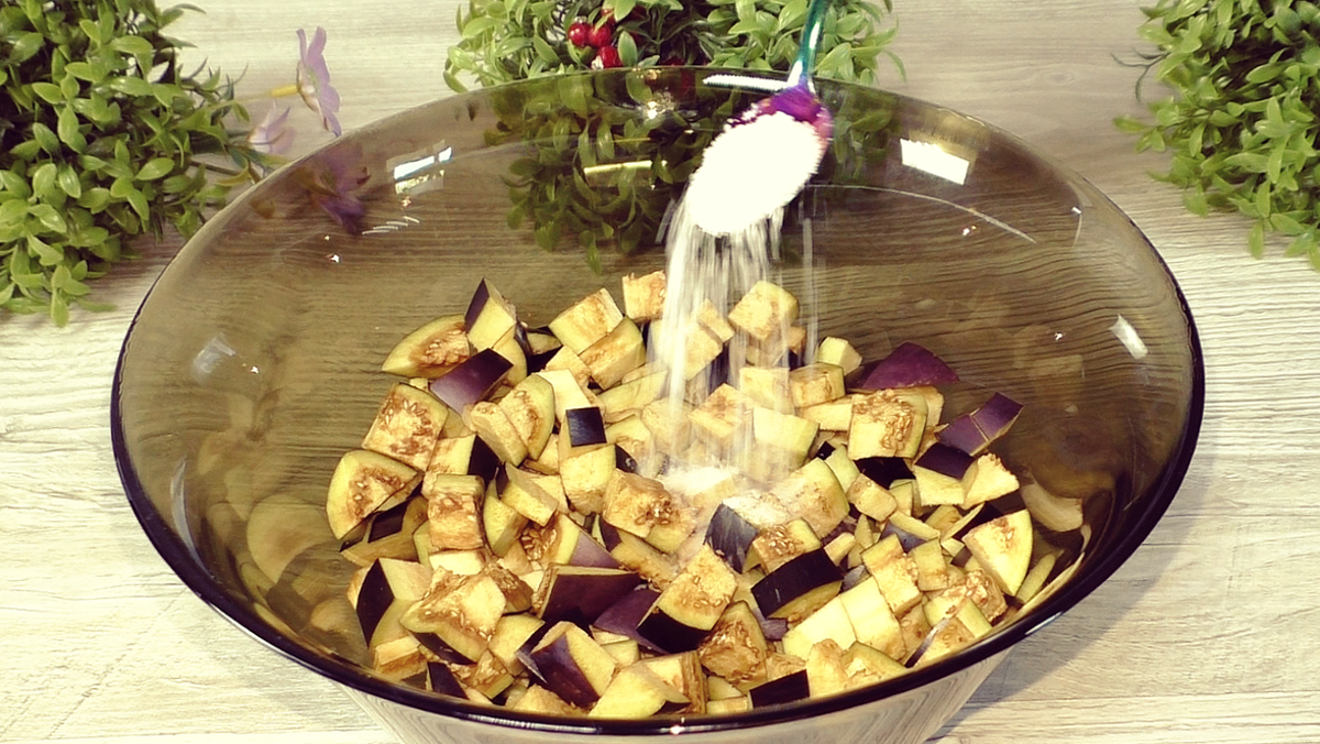 Для начала необходимо тщательно вымыть баклажаны и нарезать их на небольшие кубики. Молодые и нежные баклажаны лучше не очищать от кожицы. В отдельной миске стоит посолить нарезанные овощи, добавив 1 чайную ложку соли, и оставить их на некоторое время, чтобы они пустили сок.