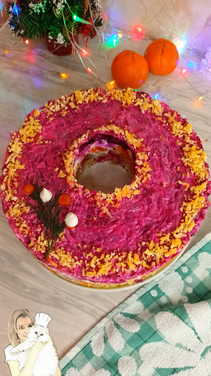 Вечером в квартире пахнет праздником, и кажется, что всё держится аккуратно, если слои ложатся ровно и не расползаются под рукой. Так и выходит: держать форму помогает простой приём — начинать с слоя майонеза и не забывать уплотнять края ложкой между слоями.