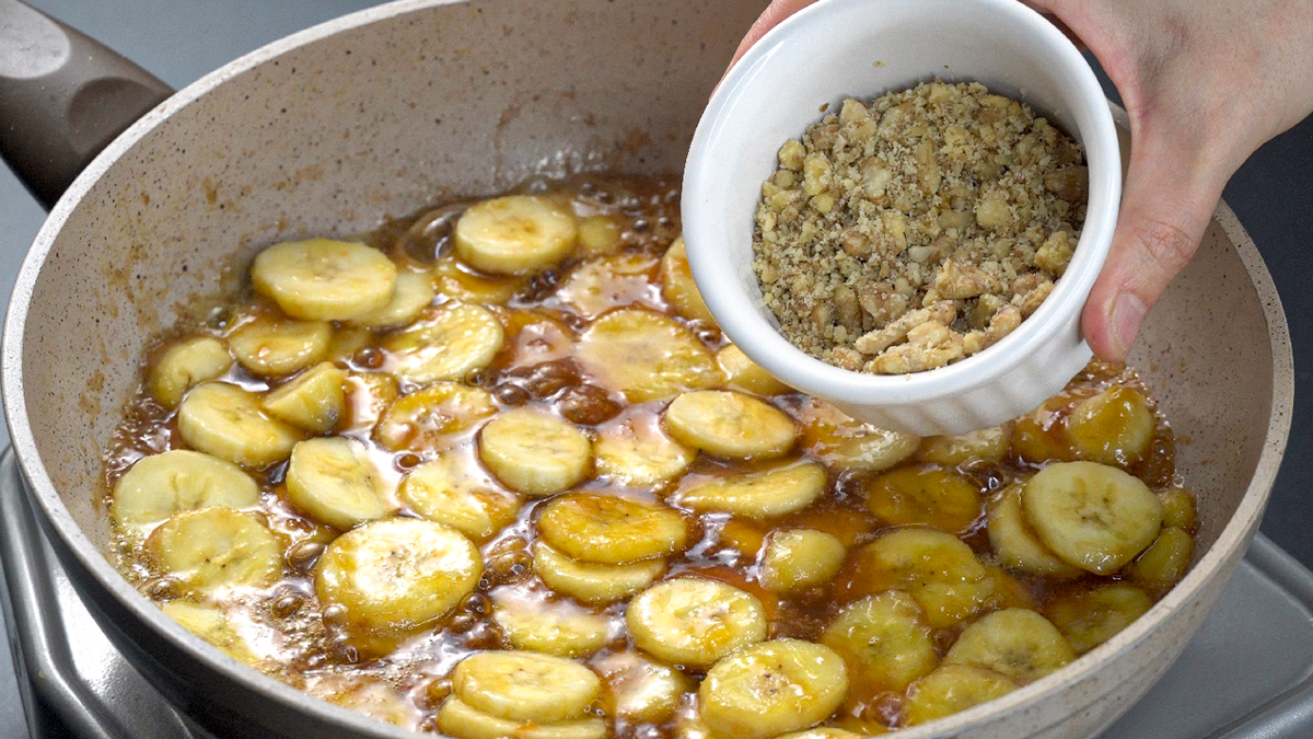 Нарезанные бананы сбрызгиваются свежевыжатым лимонным соком. Затем на сковороде нужно растопить сахар на небольшом огне, постоянно помешивая. Как только сахар полностью растворится, добавляется сливочное масло, а затем и нарезанные бананы. Тщательно перемешивая, карамелизируйте их на протяжении пяти минут, после чего можно посыпать орехами.