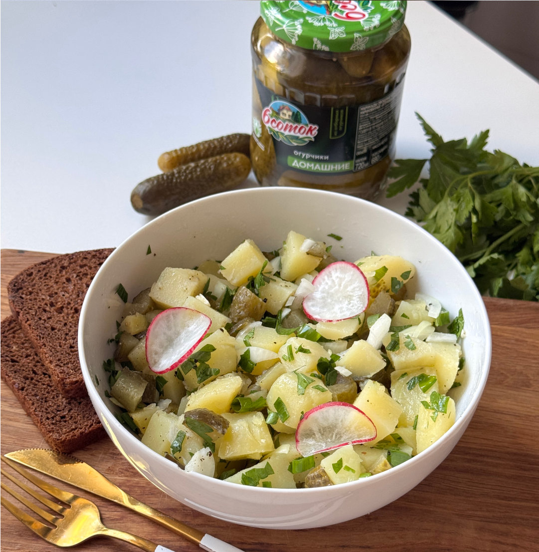 Когда хочется чего-то простого, сытного и домашнего, на помощь приходит картофельный салат с солеными огурцами «6 соток». Это блюдо идеально подходит как гарнир, так и как самостоятельная закуска!