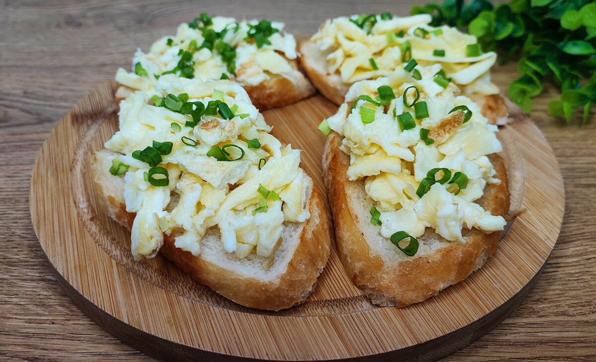 После того как яйца достигнут желаемой консистенции, мягкие и слегка влажные, аккуратно выложите их на поджаренные ломтики батона. Сверху посыпьте мелко нарезанным зеленым луком. И вот — ваш французский завтрак готов!