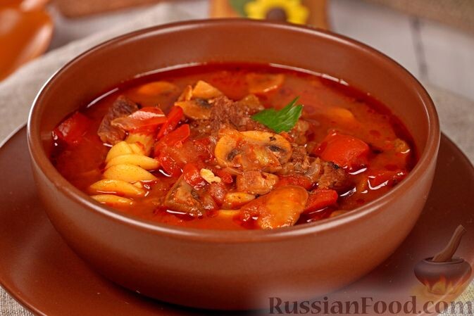 - Бограч с грибами и макаронами. Этот венгерский суп-гуляш отличается ароматом и сытностью благодаря говядине, шампиньонам и большим количествам паприки. Макароны придают этому блюду новые акценты, делая его уникальным и запоминающимся.