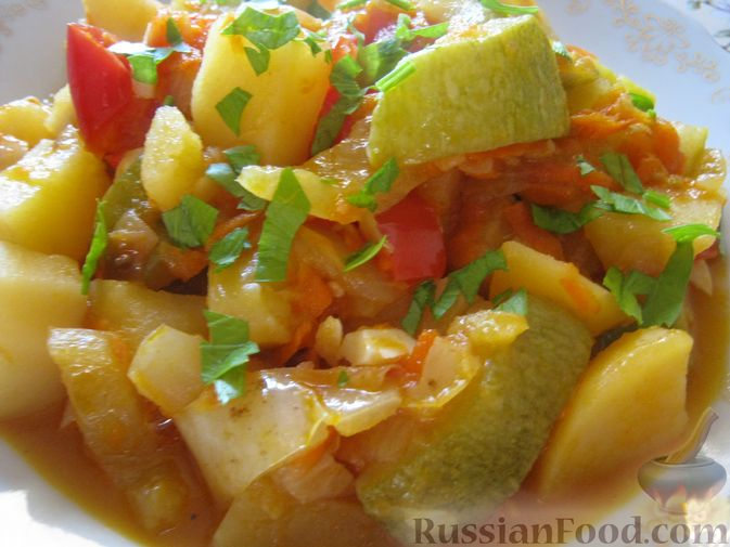 И напоследок, ещё один интересный рецепт: овощное рагу с картофелем, кабачками, помидорами и болгарским перцем. Для визуального удовольствия лучше всего использовать сладкий перец разных цветов.