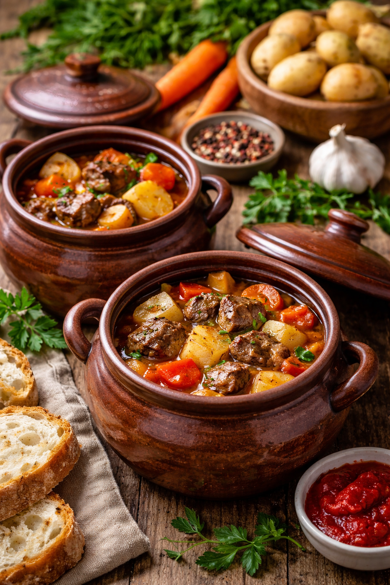 Пошаговый процесс включает обжаривание говядины до румяной корочки, нарезку овощей, укладку всех ингредиентов в горшочки и медленное приготовление в духовке. После двух часов, когда мясо станет нежным, а овощи пропитаются ароматами, блюдо будет готово к подаче.