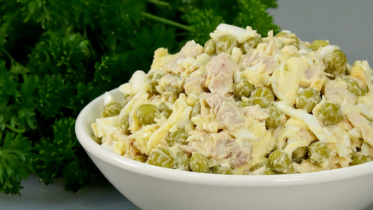 - Ингредиенты: 2 куриных окорочка, 1 банка консервированного зеленого горошка, 4 вареных яйца, 70 г твердого сыра, 2 ст. ложки домашнего майонеза, 1 зубчик чеснока, черный молотый перец и соль.