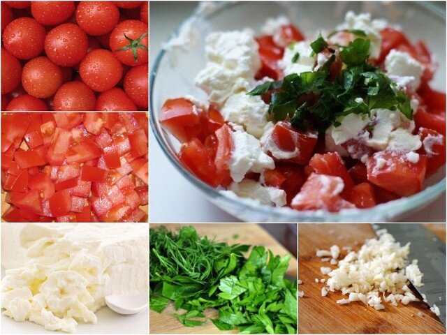 Начните с нарезки помидоров на кубики и поместите их в салатницу. Добавьте к ним нарезанный кубиками творожный сыр и мелко порезанную зелень.