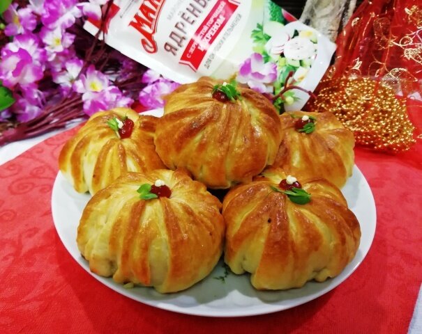 Каждый кусочек раскатывается тонко, смазывается маслом, а затем наполняется начинкой — картофелем и мясом. Заворачиваем в виде мешочка и выкладываем на противень, смазываем смесью масла и желтка. Выпекаем в духовке при 200°С до золотистого цвета в течение 20 минут.