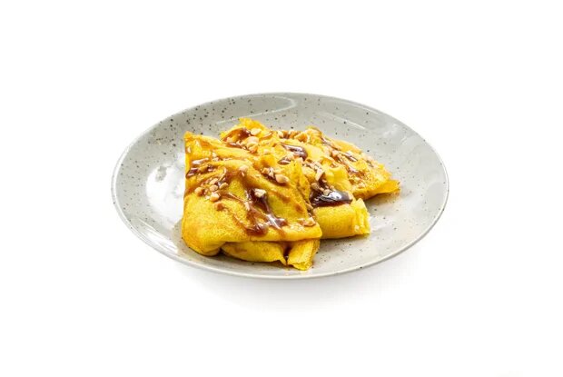 Жёлтые блины — это не только красиво, но и вкусно! Приготовить такие блинчики можно, добавив в тесто куркуму, что придаёт им яркий оттенок. В качестве оригинальной начинки предлагается сочетание бананов, жареного арахиса и карамельного соуса, что создаёт идеальный баланс сладости и насыщенности.