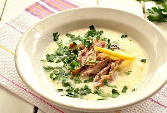 Когда чихиртма закипит, её можно снять с огня. Куриное мясо отделяется от костей и выкладывается в тарелку. Суп аккуратно наливается сверху, а для украшения служат долька лимона и свежая зелень.