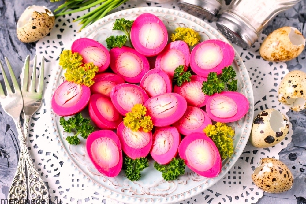 - Маринованные яйца с свёклой — эффектное блюдо для любителей красок на столе. Яркие и аппетитные, они точно привлекут внимание гостей!