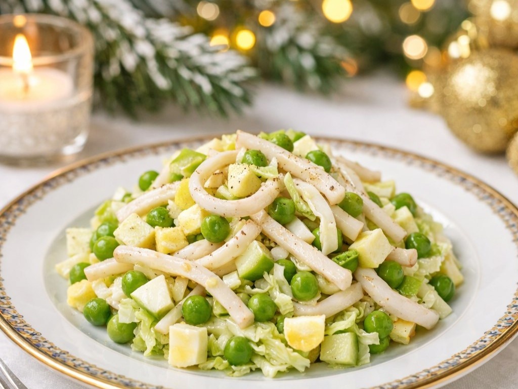 Порадуйте своих близких легким и оригинальным салатом, который отлично подойдет для праздничного стола или повседневного ужина. Нежные кальмары, свежие яблоки, хрустящая пекинская капуста и зелёный горошек в сочетании с майонезом создают гармоничное сочетание, которое не оставит равнодушным никого.