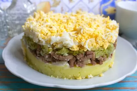 Этот простой и сытный слоеный салат обязательно порадует любителей блюд с субпродуктами. Он идеально подходит как для обеда, так и для ужина и легко готовится. Каждый слой можно посолить и заправить майонезом по вкусу. При желании, слои можно многократно повторить, чтобы получить более высокий и впечатляющий салат. Также вместо говяжьей печени можно использовать куриную или свиную. Не забудьте добавить любимые специи для улучшения вкуса!