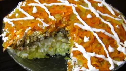 - Четвертый слой – обжаренные овощи (лук с морковью). Подсолите по вкусу и украсьте сверху майонезной сеточкой.