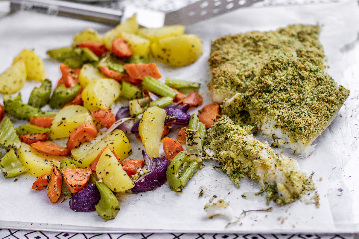 Шаг 3: Переложите треску на противень с овощами. Сбрызните растительным маслом и посыпьте панировкой с зеленью. Запекайте в духовке примерно 14-16 минут при температуре 180 градусов. Учитывайте особенности вашей духовки для повышения точности времени приготовления. Подавать блюдо на тарелке, украсив оставшейся зеленью. Приятного аппетита!