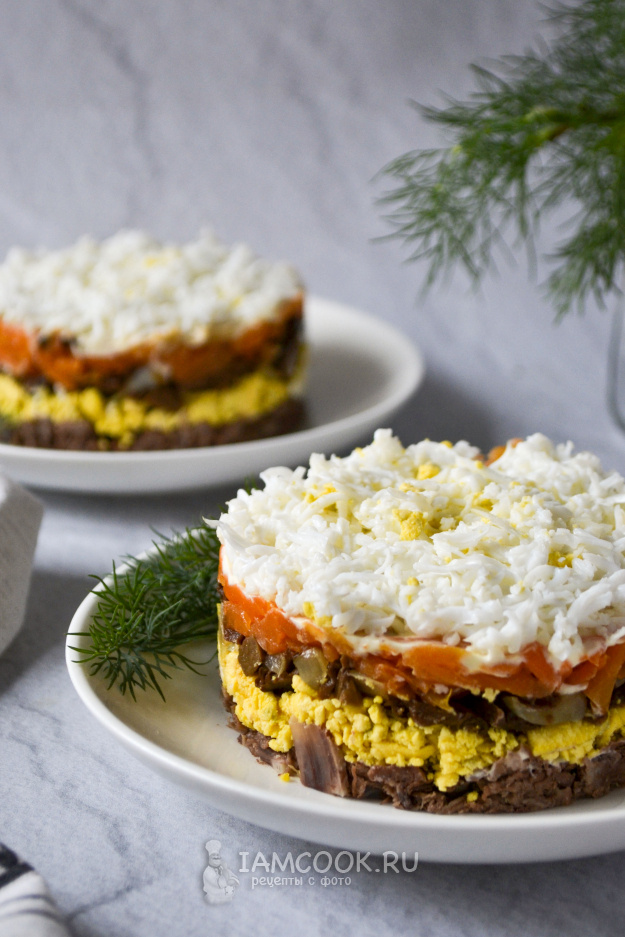 Салат «Сказка» — это не просто блюдо, а настоящая кулинарная история, полная ярких вкусов и волшебства. Представьте себе: говядина – это основа, а грибы с луком образуют тенистый лес в закатных оттенках. Яркая морковка символизирует солнечные лучи, а яйца словно пушистые облака, создающие неповторимую композицию. На праздничном столе такой салат становится настоящей королевой вечера!