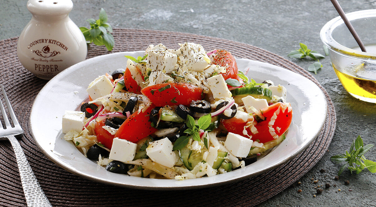 - Греческий салат с пекинской капустой. В этом свежем салате гармонично сочетаются хрустящие овощи и оливковое масло. Узнать рецепт