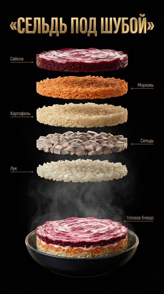 Каждый элемент оформляется со вкусом и в едином стиле. Элегантные подписи на русском языке, такие как «Зелень», «Морковь», «Картофель», создают дополнительный акцент на каждом слое с помощью тонких стрелок. Это позволяет подчеркнуть не только традиционность блюда, но и его современное исполнение.