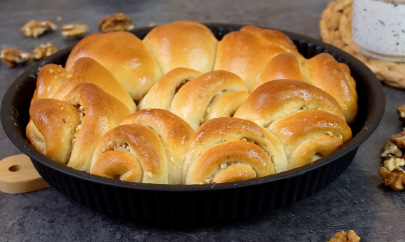 Когда тесто поднимется, разделите его на небольшие части, формируя из них колобки. Каждый раскатывают в круг, смазывают маслом, выкладывают начинку и делят на лепестки, заворачивая в форме рожка.