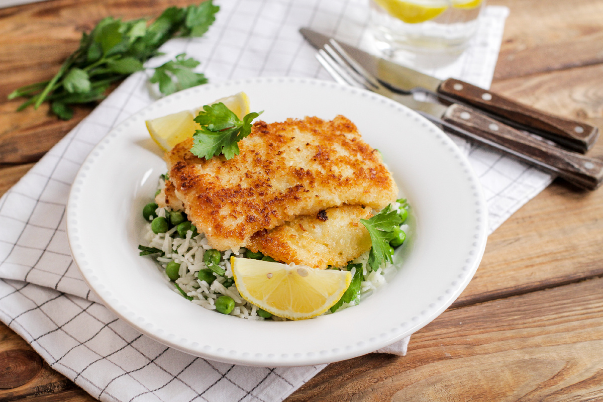 Шаг 5: Мелко нарезайте петрушку. Добавьте её, оливковое масло и горошек к готовому рису, перемешайте. Подавайте треску, сбрызнув лимонным соком по желанию. Приятного аппетита!