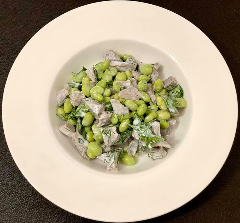 Этот салат — отличный выбор для любителей оригинальных и питательных блюд. В нем гармонично сочетаются мягкий отварной язык, зеленые соевые бобы и свежая зелень, создавая не только вкусный, но и полезный вариант перекуса или полноценного обеда.