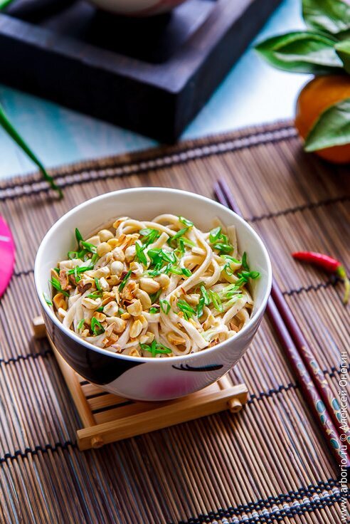 Слейте воду, добавьте лапшу к соусу и хорошо перемешайте, чтобы лапша покрылась соусом. Разложите по тарелкам, посыпьте жареным арахисом и нарезанным зелёным луком. Для усиления аромата можно добавить несколько капель кунжутного масла.