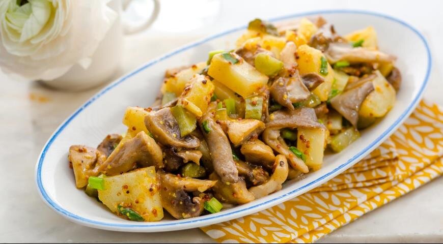 Этот постный салат является оригинальной интерпретацией классического немецкого картофельного салата, но без бекона. Несмотря на свою легкость, он способен удивить насыщенностью вкусов и текстур. В качестве гриба лучше использовать шампиньоны, которые быстро обжариваются и отличают замечательным вкусом.