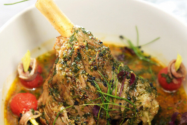 Каждый помидор следует проколоть в нескольких местах зубочисткой, после чего замариновать в теплом оливковом масле с добавлением зубчика чеснока и веточек тимьяна и розмарина на 2-3 часа.В глубоком сотейнике на двух столовых ложках оливкового масла обжарить голяшку со всех сторон до золотистой корочки и переложить в форму для запекания.В сотейник добавить крупно нарезанные лук, морковь и сельдерей, затем ввести томатную пасту. После этого влить вино, немного проварить и добавить овощной бульон, половинку головки чеснока, перец чили, тимьян, розмарин, перец горошком и лавровый лист. Довести до кипения и залить соусом голяшку.Запекать в духовке при 180 градусах в течение полутора часов, переворачивая голяшку каждые полчаса.По завершении приготовления, голяшку вынуть, а соус процедить. Уплотнить соус на среднем огне в течение 10-15 минут и прогреть в нем голяшку, добавив мелко нарезанный чеснок, тимьян и розмарин, приправить по вкусу.Подавать голяшку, полив соусом, рядом разместить помидоры черри, украшенные анчоусами и полить приготовленным песто. Добавить немного горчицы и украсить свежим базиликом и кресс-салатом.