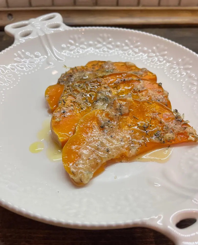 Получившуюся массу распределите по ломтикам тыквы в форме для запекания. Далее ставьте ее в заранее разогретую до 180 градусов духовку и запекайте в течение 40 минут. За это время вы получите идеальное сочетание вкуса и аромата!