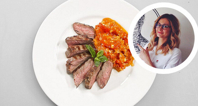 После отдохновения стейки нарезаются на кусочки и подаются с луково-помидорной смесью и веточкой мяты для украшения. Это блюдо идеально подойдет как для семейного ужина, так и для званого вечера.