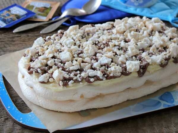 Сформируйте две одинаковые заготовки (примерно 12х20 см) и оставьте четверть белковой массы для небольшого коржа.