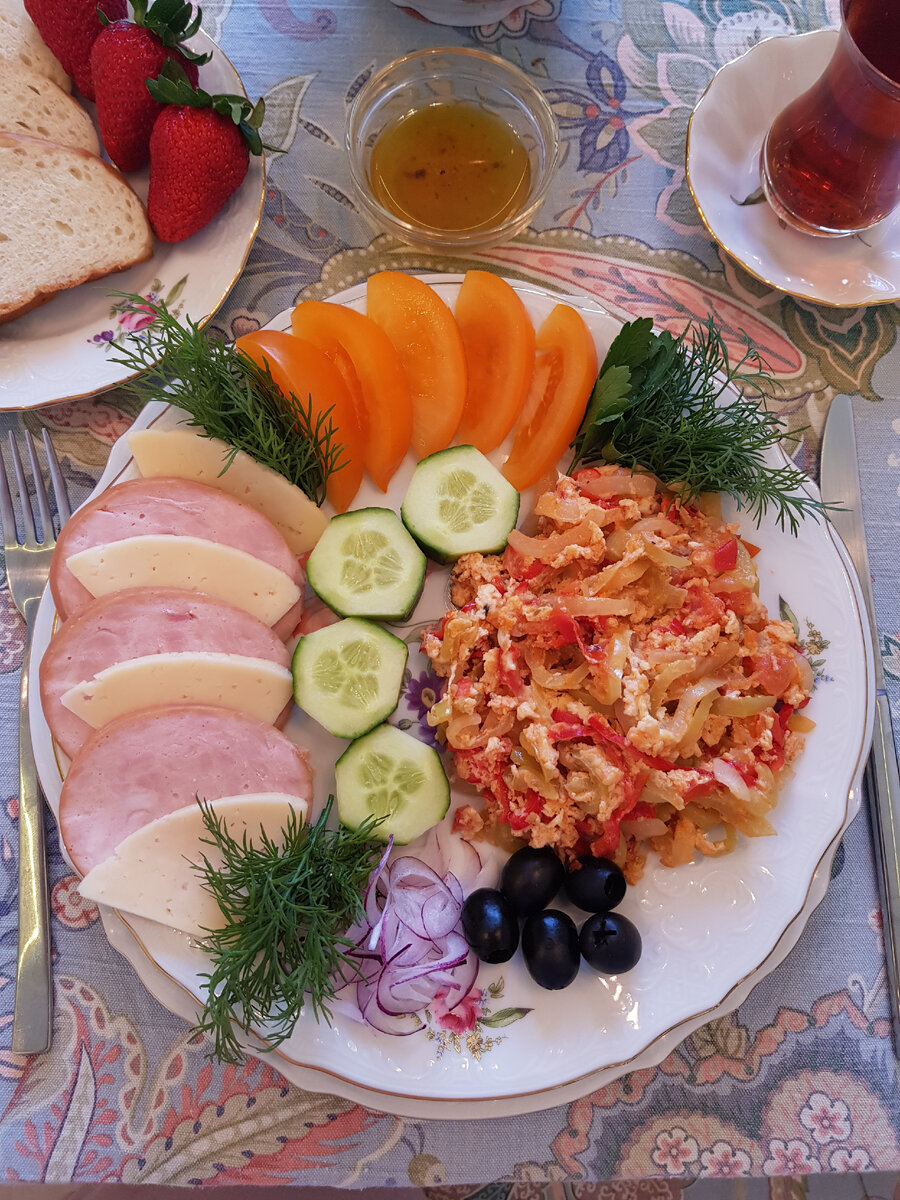 6. Для соуса просто смешайте оливковое масло с лимонным соком и приправой. Подавайте менемен на тарелке с нарезанными овощами, ветчиной и сыром, полейте соусом и дополните свежим турецким чаем с клубникой. Приятного аппетита!
