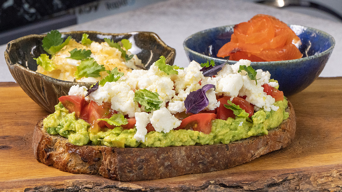 Завершим королевский завтрак бутербродом с авокадо. Размяв половинку авокадо вилкой, добавляем немного соли и несколько капель лимонного сока. Режем адыгейский сыр и сбрызгиваем оливковым маслом. На поджаренный ломтик хрустящего хлеба выкладываем пасту из авокадо, посыпаем мелко нарезанными томатами и адыгейским сыром, а сверху украшаем свежей зеленью. Такой завтрак точно поднимет настроение!