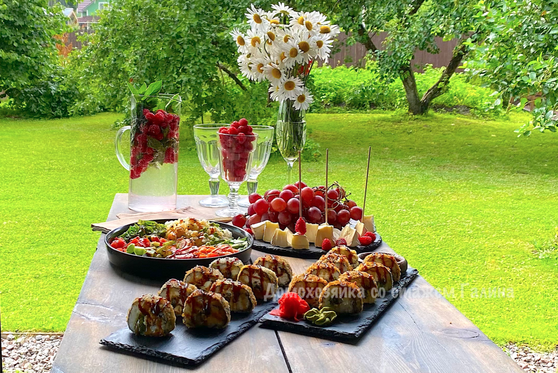 Понимание, что выезд под открытое небо теперь невозможен, не погасило настроения. После обсуждения различных альтернатив был выбран вечер в беседке с вкусным ужином. Это то место, где всегда царит атмосфера тепла и комфорта. Спонтанный замысел об ужине привел к выбору роллов с мидиями, рецепт которых оказался под рукой.