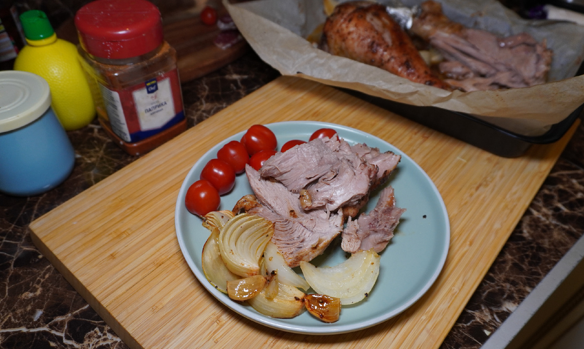 На первом этапе голени индейки помещаются в емкость для запекания. Их необходимо обильно полить оливковым маслом и щедро обсыпать специями, такими как соль, черный перец, копченая паприка и сухая абхазская аджика. После этого следует сбрызнуть все лимонным соком и хорошо перемешать, чтобы каждый кусочек был покрыт ароматной смесью.Лук крупно нарезается, а чеснок очищается от кожуры. Овощи добавляются в противень к голеням, после чего форма помещается в заранее разогретую до 230°С духовку. Immediately reduce the temperature to 180°С and bake for 45 минут. По истечении этого времени стоит проверить готовность: мясо должно легко отделяться от костей. В зависимости от размера голеней, общее время запекания может варьироваться; в некоторых случаях потребуется до 60 минут.В итоге получается сочная и ароматная голень индейки с аппетитной корочкой и овощами, которые впитали все вкусы мяса и специй. Это отличный вариант для ужина, который порадует как домашних, так и гостей.