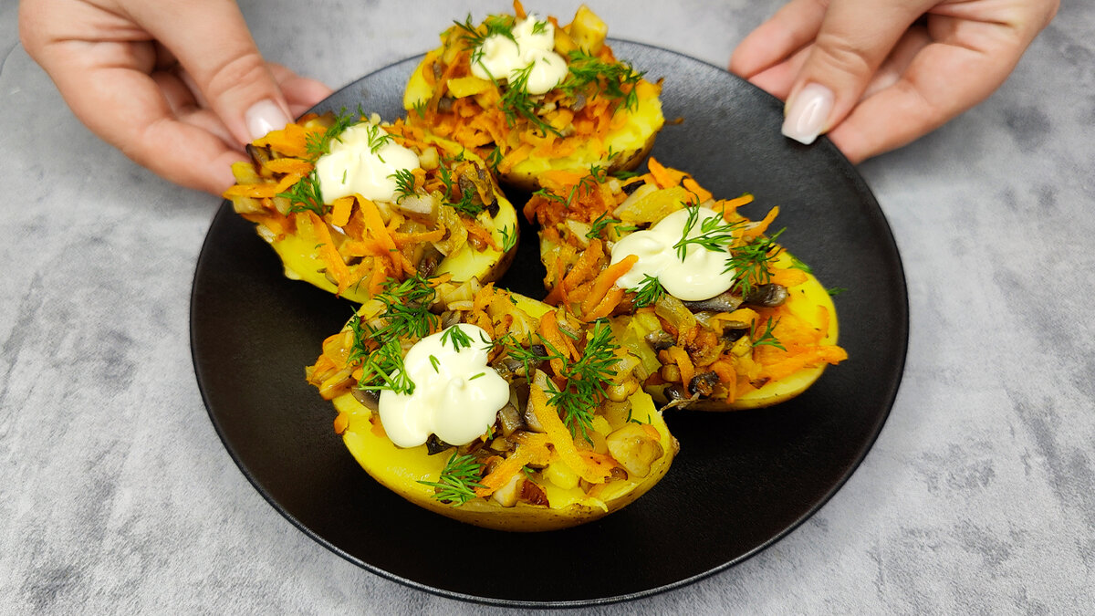 6. Достать запечённый картофель из духовки, аккуратно его разрезать и размять серединку в пюре. Углубить и заполнить начинкой из грибов с овощами, добавив несколько капель майонеза.