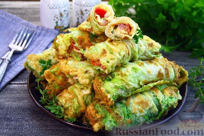 - Рулетики из пекинской капусты: Нежные листья обжаренных в кляре капустных рулетиков с ветчиной и помидорами — отличная закуска, подходящая для любого мероприятия.