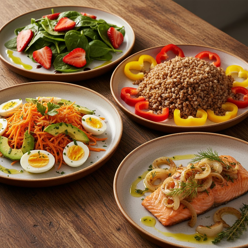 - Пример: Морковный салат с оливковым маслом, шпинат с ореховой заправкой.