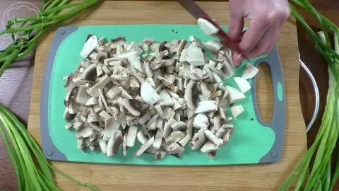 Приготовление начинается с подготовки начинки: нарезать грибы и лук, обжарить их до мягкости. Затем грибы готовятся до полной готовности, убираем лишнюю жидкость, добавляя соль и перец по вкусу.