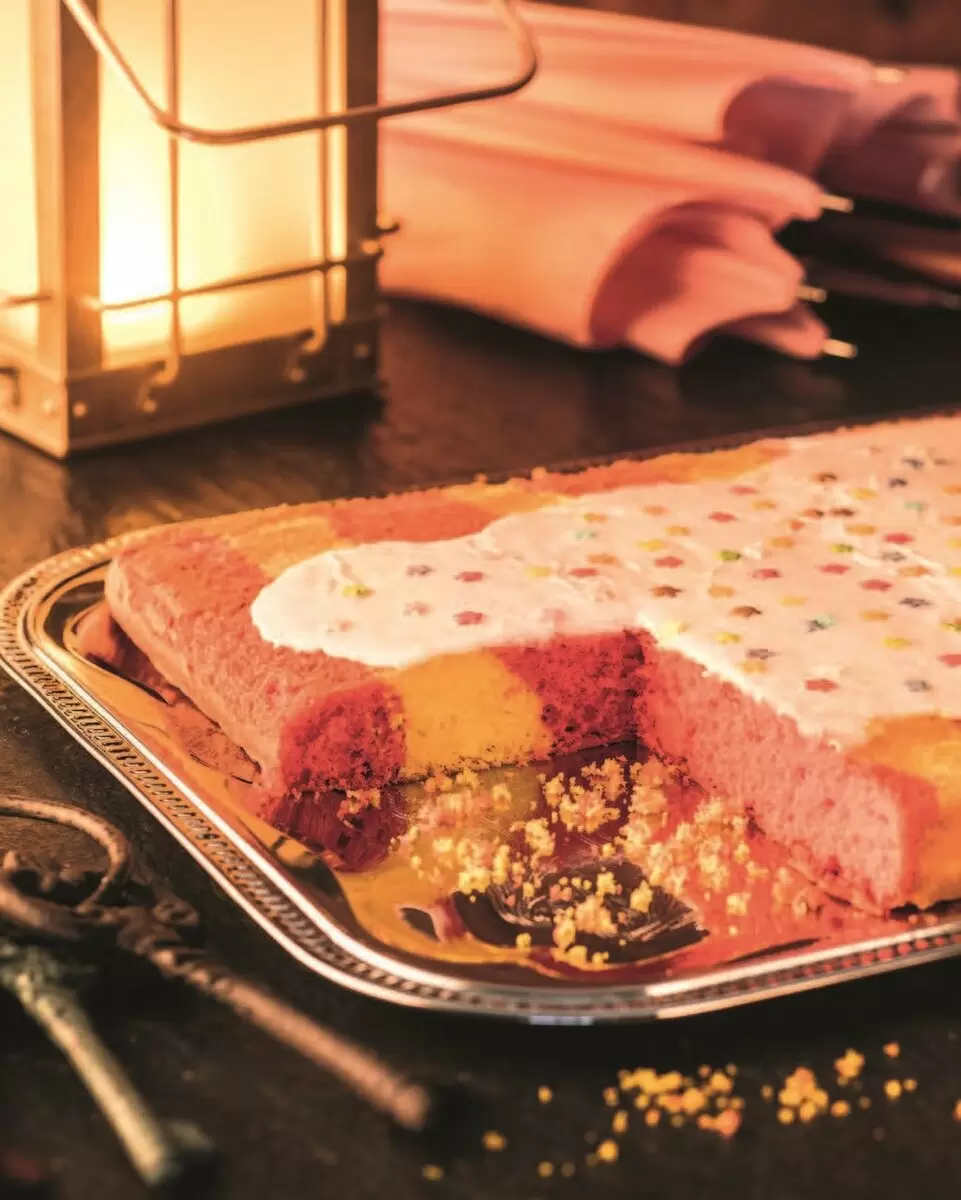 Разогрейте духовку до 180 градусов. Смазать небольшой противень сливочным маслом и посыпать мукой.В отдельной миске смешайте муку с разрыхлителем и щепоткой соли.С помощью миксера взбейте размягченное масло с ванильным экстрактом и сахаром. Вводите яйца по одному, чередуя с добавлением молока и муки, хорошо перемешивайте.Разделите тесто на две части. Окрасите каждую половину одним из пищевых красителей.Переложите цветное тесто в кондитерские мешки и отсаживайте широкие полосы на противень, чередуя цвета. Если у вас нет мешков, используйте пакеты для заморозки, отрезав уголок.Выпекайте в разогретой духовке 25-30 минут. Проверьте готовность зубочисткой; она должна выходить чистой. Остудите на противне.Для глазури смешайте сахарную пудру и лимонный сок, равномерно распределите по остывшему пирогу. Украсить цветной сахарной посыпкой и оставьте на 30 минут, чтобы глазурь подсохла.