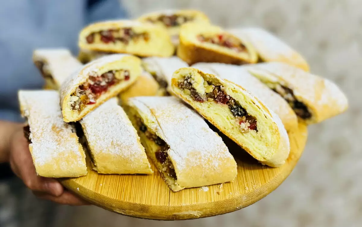 Пока тесто «отдыхает», можно заняться начинкой. Белок взбивают с сахаром до образования пиков, после чего добавляют нарезанные грецкие орехи, изюм и сухофрукты. Все это щедро перемешивается, и начинка готова.