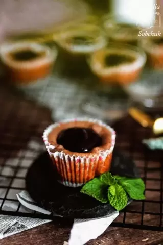Форму для кексов застелить бумажными капсулами, на дно выложить 2 ч.л. песочной крошки, а затем отсадить творожную массу, оставляя немного места сверху. Выпекать в заранее разогретой до 180° духовке около 30-50 минут в зависимости от техники. После выпечки охладить на решетке и украсить конфитюром из черной смородины.