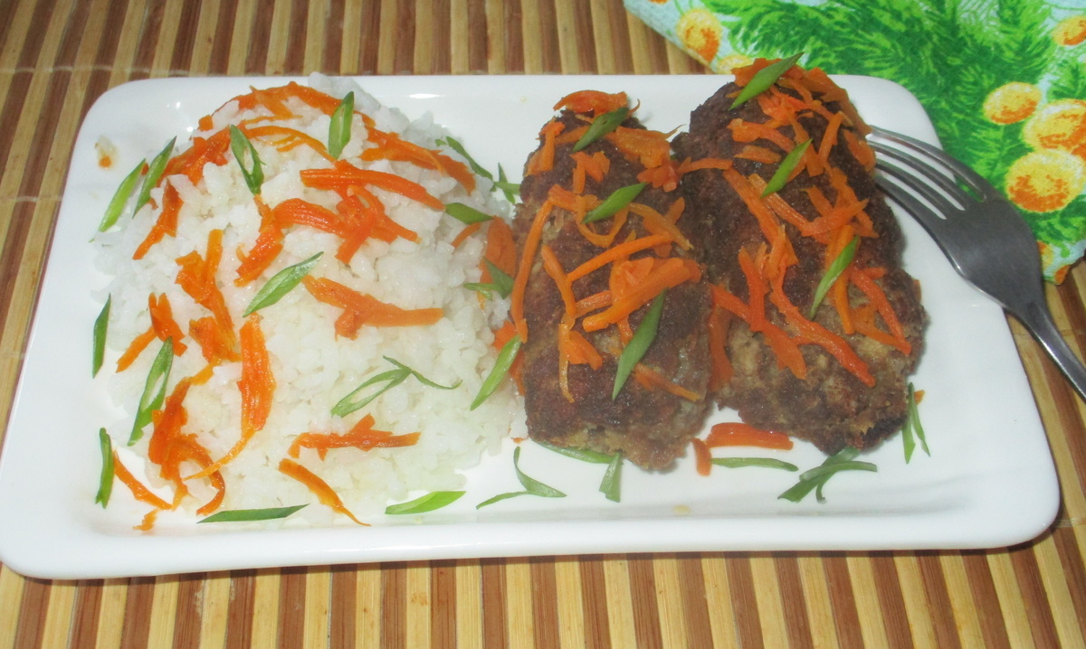 Готовые зразы выкладываются на тарелку с гарниром из вареного риса и украшаются тертой морковью и зелеными луками. Это простое, но очень вкусное блюдо непременно станет любимым у вашей семьи!