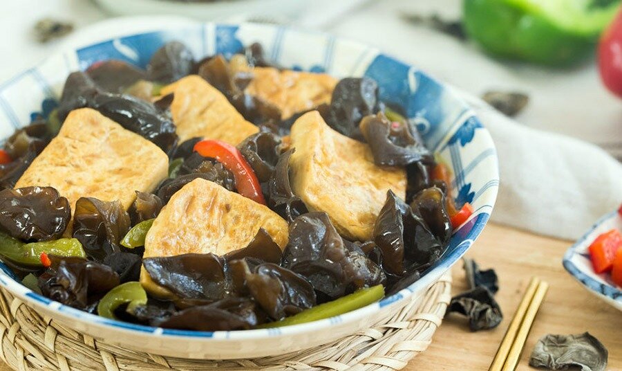 Начать стоит с подготовки грибов. Их необходимо замочить в теплой воде на полчаса, затем тщательно промыть. После этого следует разорвать грибы на небольшие кусочки и опустить в кипящую воду на 2 минуты. Грибы готовы! Извлеките их и отложите в сторону.Переходим к овощам. Болгарский перец нарезается тонкими полосками, а тофу — кубиками размером 3-4 см и толщиной около 1 см.Разогрейте сковороду с растительным маслом и обжарьте тофу до появления золотистой корочки. Затем добавьте подготовленные грибы и болгарский перец. Полейте соевым соусом и аккуратно перемешайте. Влейте 150 мл горячей воды, накройте крышкой и тушите 3-4 минуты.Разведите крахмал в 100 мл воды и влейте в сковороду. Приправьте по своему вкусу, перемешайте и доведите до кипения. Как только соус станет полупрозрачным, можно снимать с огня.Переложите готовое блюдо в красивую посуду и полейте ароматным соусом. Блюдо готово к подаче!Приятного аппетита!