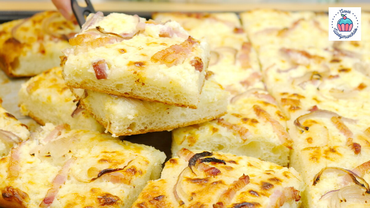 Соберите пирог, распределив соус на тесте, затем выложите грудинку и лук. Выпекайте в разогретой духовке в течение 15-20 минут, первые 10 минут на нижнем уровне. Ориентируйтесь на свою духовку.